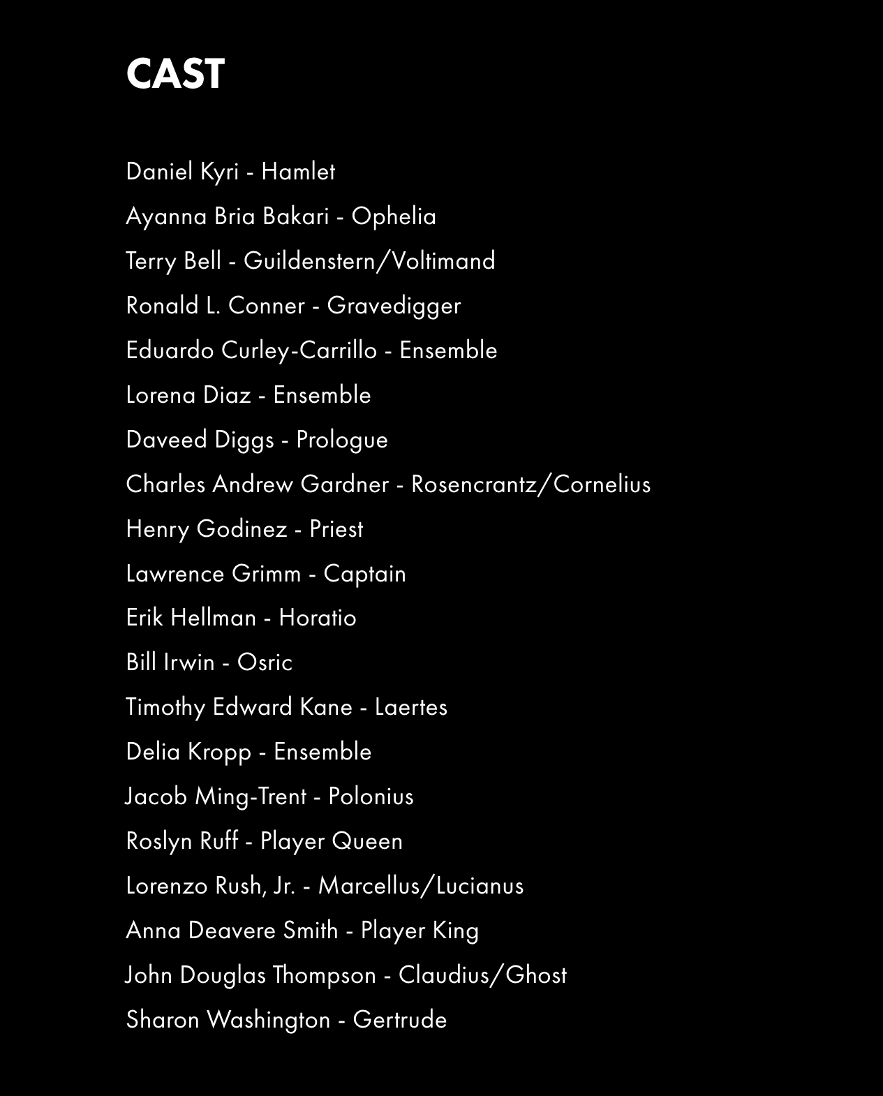 Featuring: Daniel Kyri, Ayanna Bria Bakari, Terry Bell, Ronald L. Conner, Eduardo Curley-Carrillo, Lorena Diaz, Daveed Diggs, Charles Andrew Gardner, Henry Godinez, Lawrence Grimm, Erik Hellman, Bill Irwin, Timothy Edward Kane, Delia Kropp, Jacob Ming-Trent, Roslyn Ruff, Lorenzo Rush, Jr., Anna Deavere Smith, John Douglas Thompson, & Sharon Washington